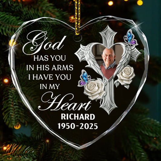 Custom Photo God Has You In His Arms Memorial - Personalized Heart Shaped Glass Ornament