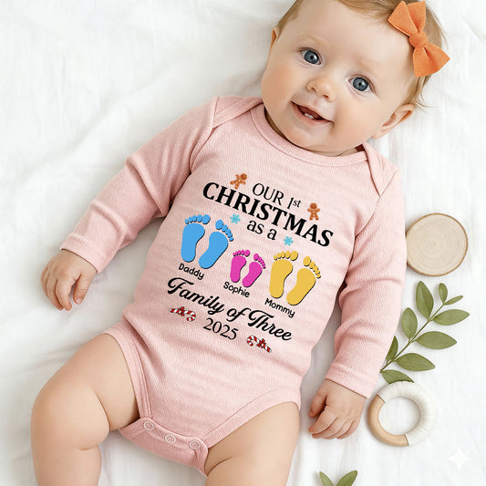 First Christmas As A Family Of 3 - Personalized Long Sleeve Baby Onesie