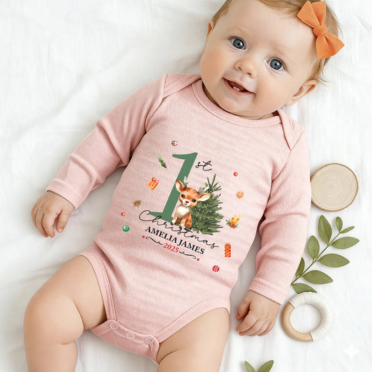 Cute Reindeer First Christmas - Personalized Long Sleeve Baby Onesie