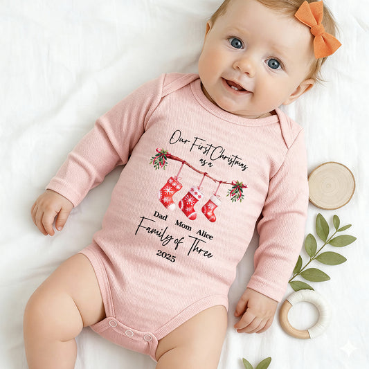 Our First Christmas As A Family Of Three Stockings - Personalized Long Sleeve Baby Onesie