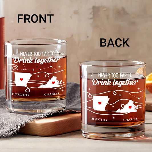 Never Too Far To Drink Together - Personalized Round Whiskey Glass