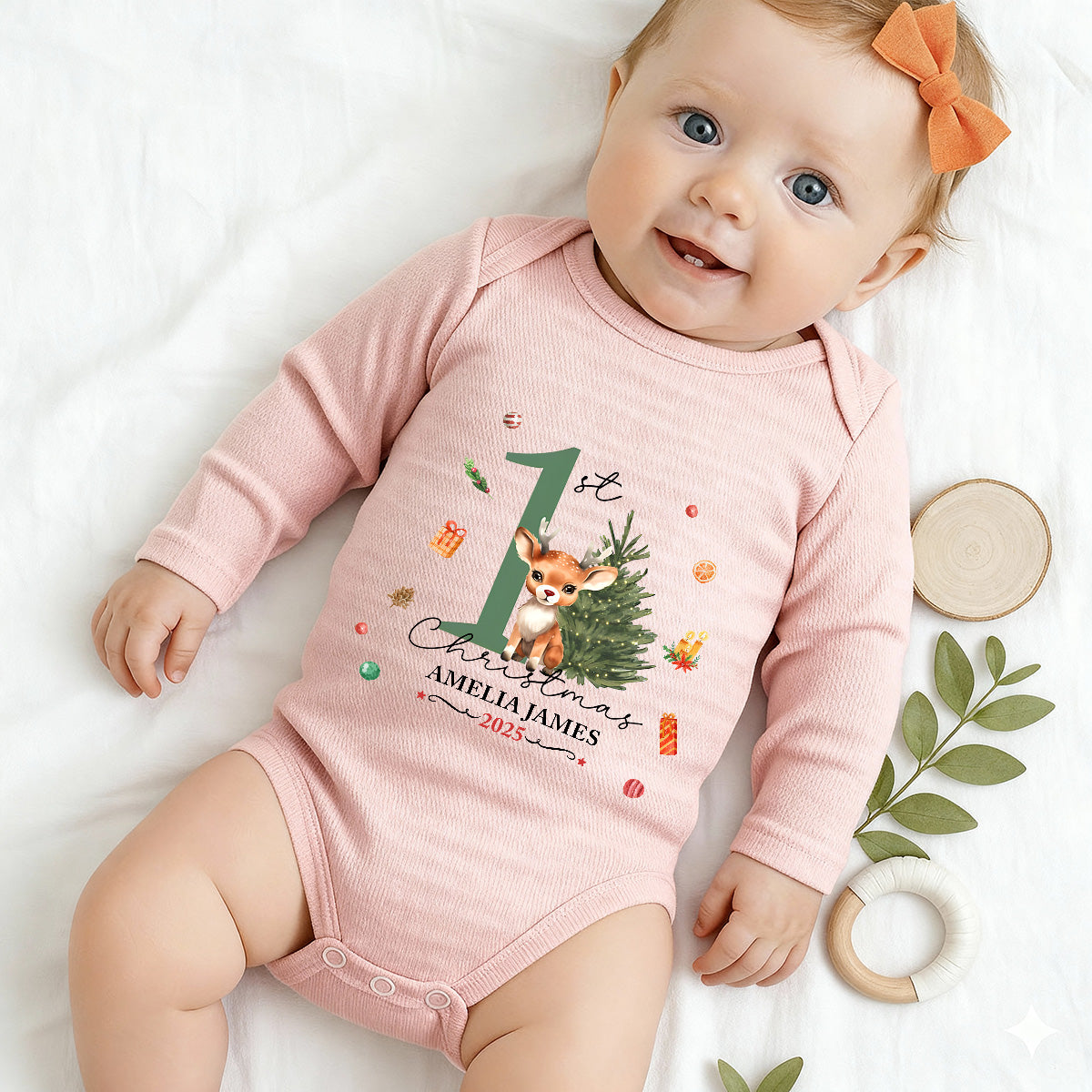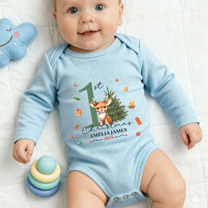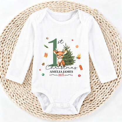 Cute Reindeer First Christmas - Personalized Long Sleeve Baby Onesie
