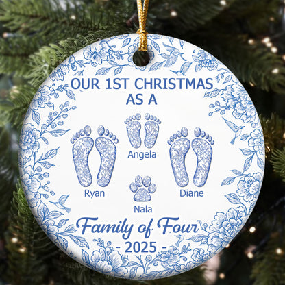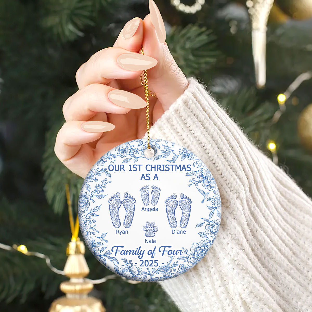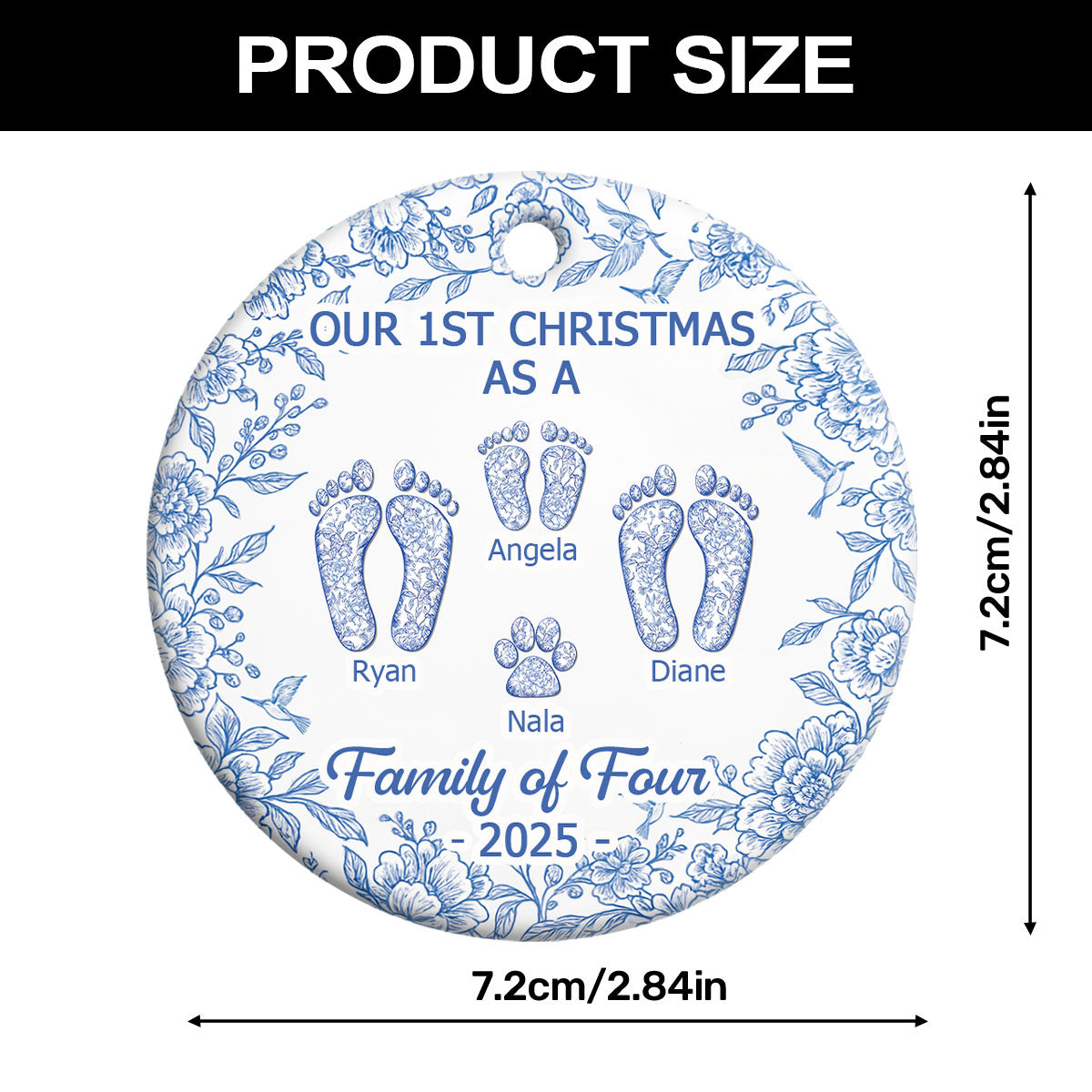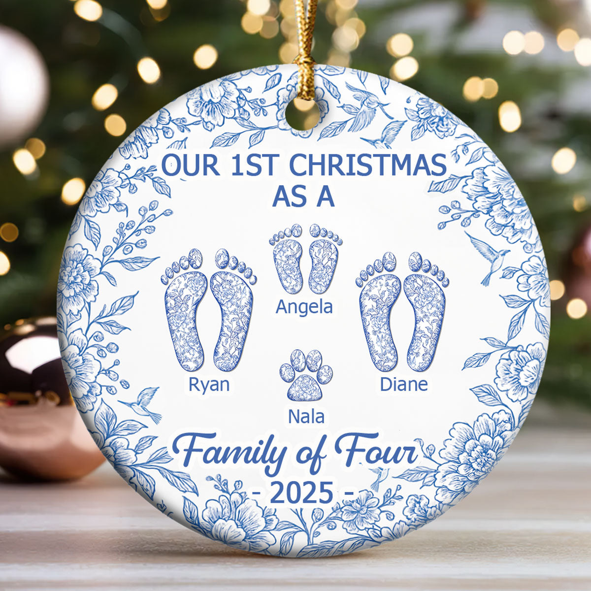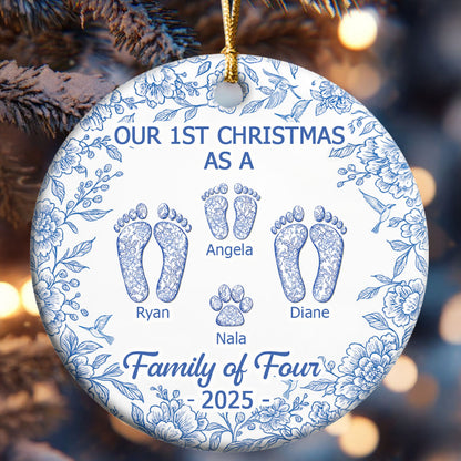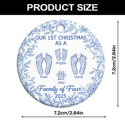 First Christmas As A Family Of Four Toile Footprints - Personalized Round Shaped Ceramic Ornament